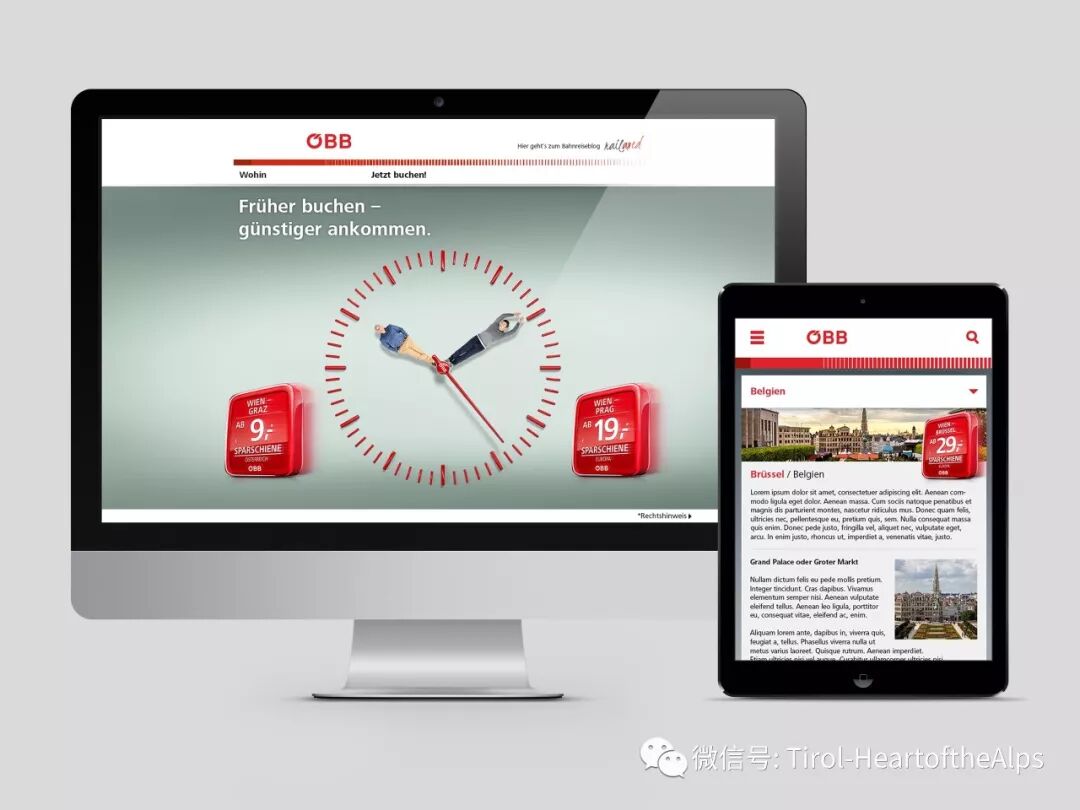 奥地利联邦火车局的优惠票” Sparschiene“:这种由奥地利联邦铁路局提供的价格极其优惠的火车票需要在网上提前预定,在奥地利境内或者属于意大利的南蒂罗尔区域的的该类火车票只需9欧元起:如前往奥地利西部福阿尔贝格首府勃列艮茨为9欧元;前往南蒂罗尔州城市博城和勃列克森:9欧元;前往萨尔茨堡19欧元;跨国之间的临近城市如慕尼黑14欧元;苏黎世19欧元。详细信息和订票请通过网站www.oebb.at>sparschiene奥地利蒂罗尔州观光局官方微信公众号
